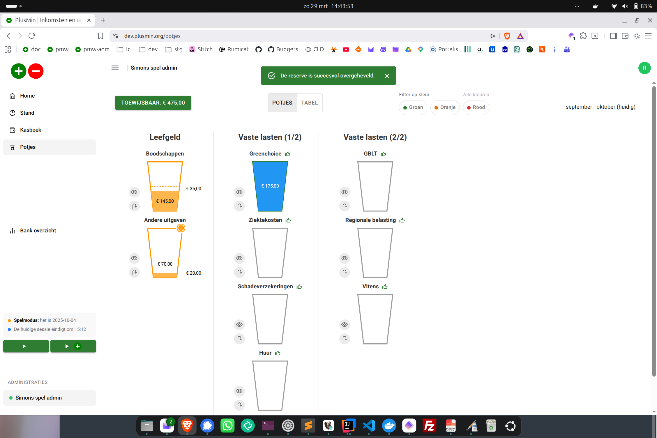 Het is feest in de wereld van de potjes! Alle vaste lasten zijn strak gevuld en stralen in een trotse blauw. Zelfs het potje ‘Andere Uitgaven’ heeft een klein surplusje: 12 euro meer dan verwacht, want: nog niets besteed. Maar wacht, kijk daar! Het boodschappen potje is nog steeds oranje. Die Lidl-trip van gisteren kostte €55, dus €31 meer dan gepland voor één dag. Geen paniek, Simon! Dit is gewoon de realiteit van een volle maag versus een strak budget. De rest van de maand ziet er nog steeds rooskleurig uit, dus laten we die oranje vlek zien als een klein avontuur.